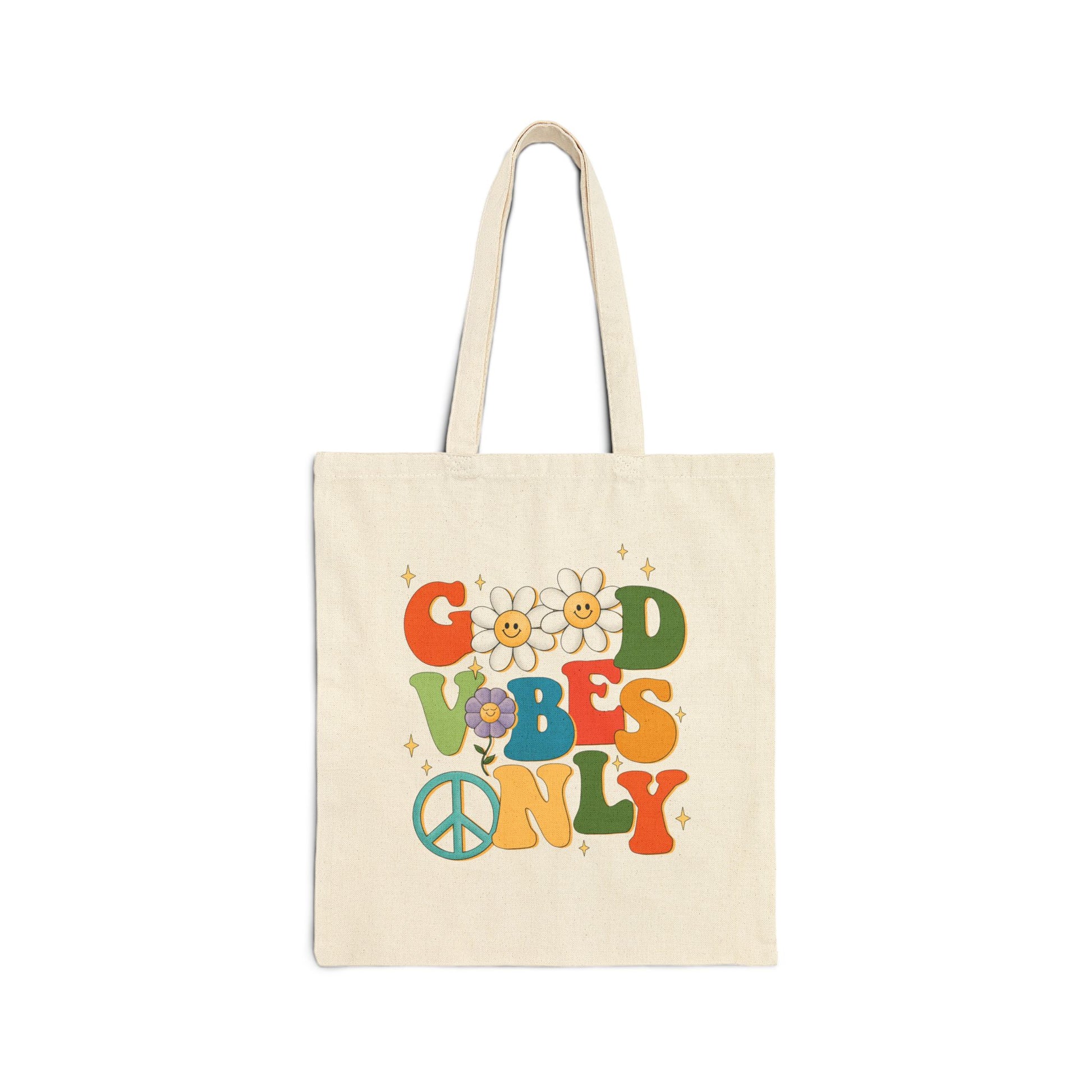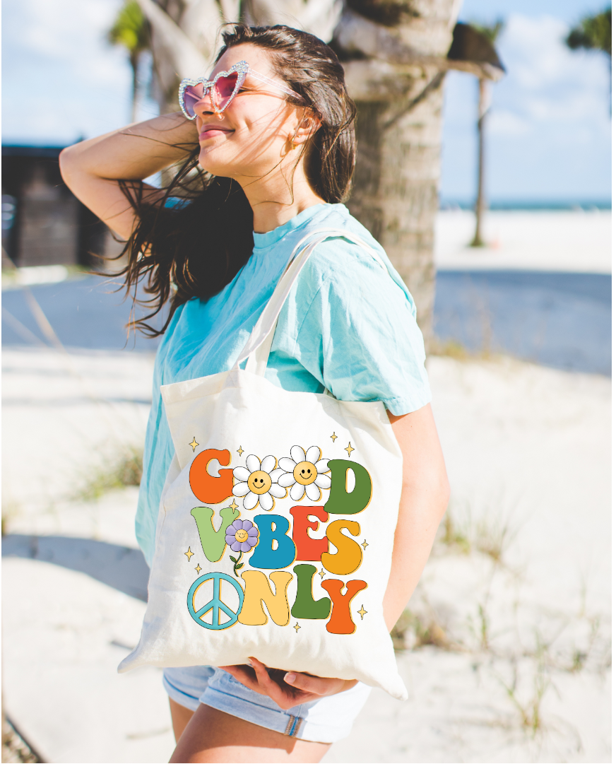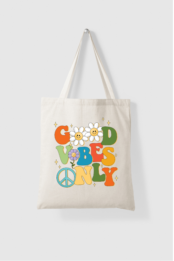 Tote Bag Eco "Good Vibes Only" (Diseño Grove Retro) es el accesorio perfecto para quienes llevan su esencia positiva a donde van. Para aquellos que eligen transmitir alegría a quienes lo necesitan y responden con una sonrisa a la negatividad. Este tote es un recordatorio constante de que las buenas vibras siempre prevalecen.